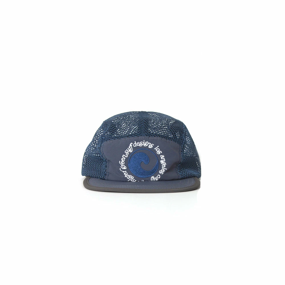 Mister Green Dualism caps feature a camp style profile with mesh panels, a lightweight nylon front panel and back strap enclosure, as well as front “submerged” embroidery.